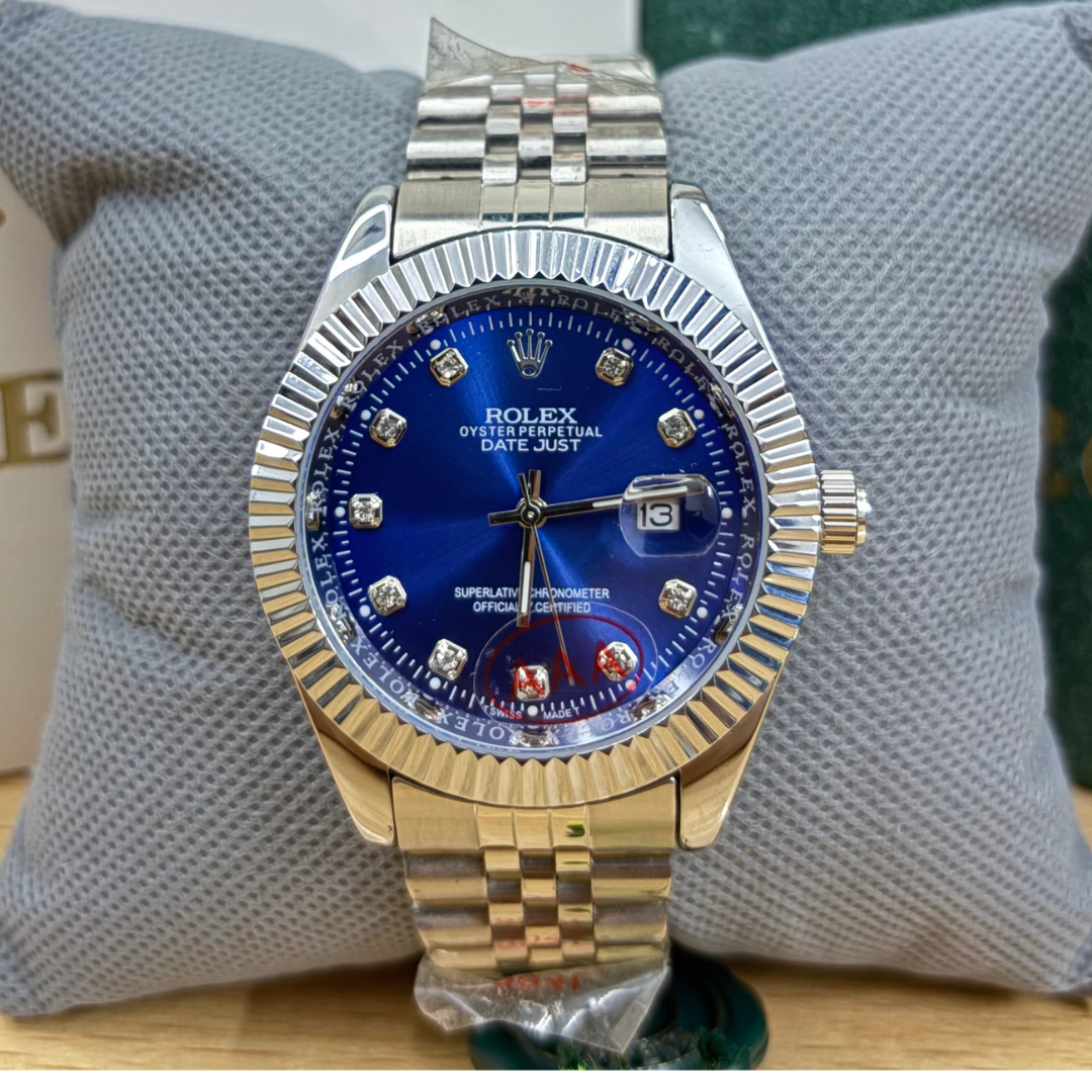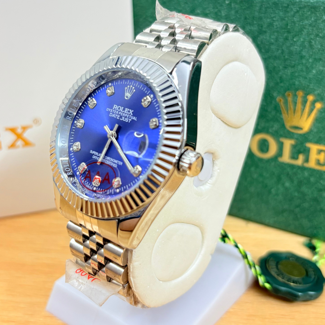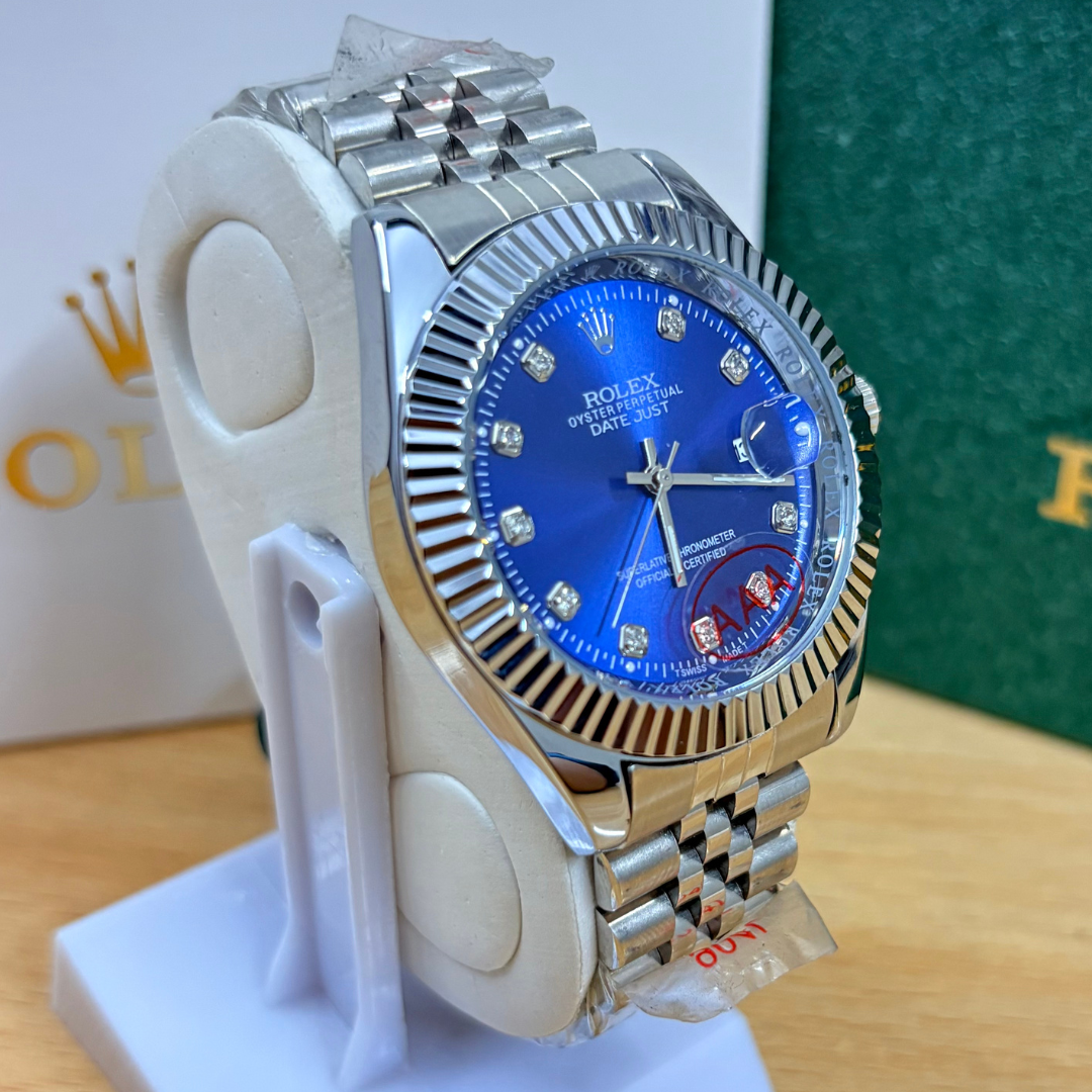 Elevate your style with the RLX DateJust 40mm, showcasing a deep blue dial and iconic fluted bezel. A perfect balance of luxury and performance, this timepiece brings a bold yet classic touch to your wrist, ideal for both casual and formal occasions.