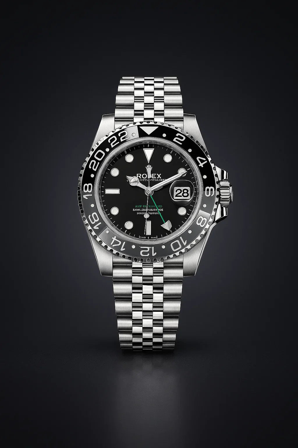 Mysterious and sleek, the RLX GMT Master Ghost Jubilee features a unique grey & black bezel paired with a refined stainless steel body. Built for those who value subtle luxury, this 40mm timepiece blends stealthy aesthetics with global functionality.