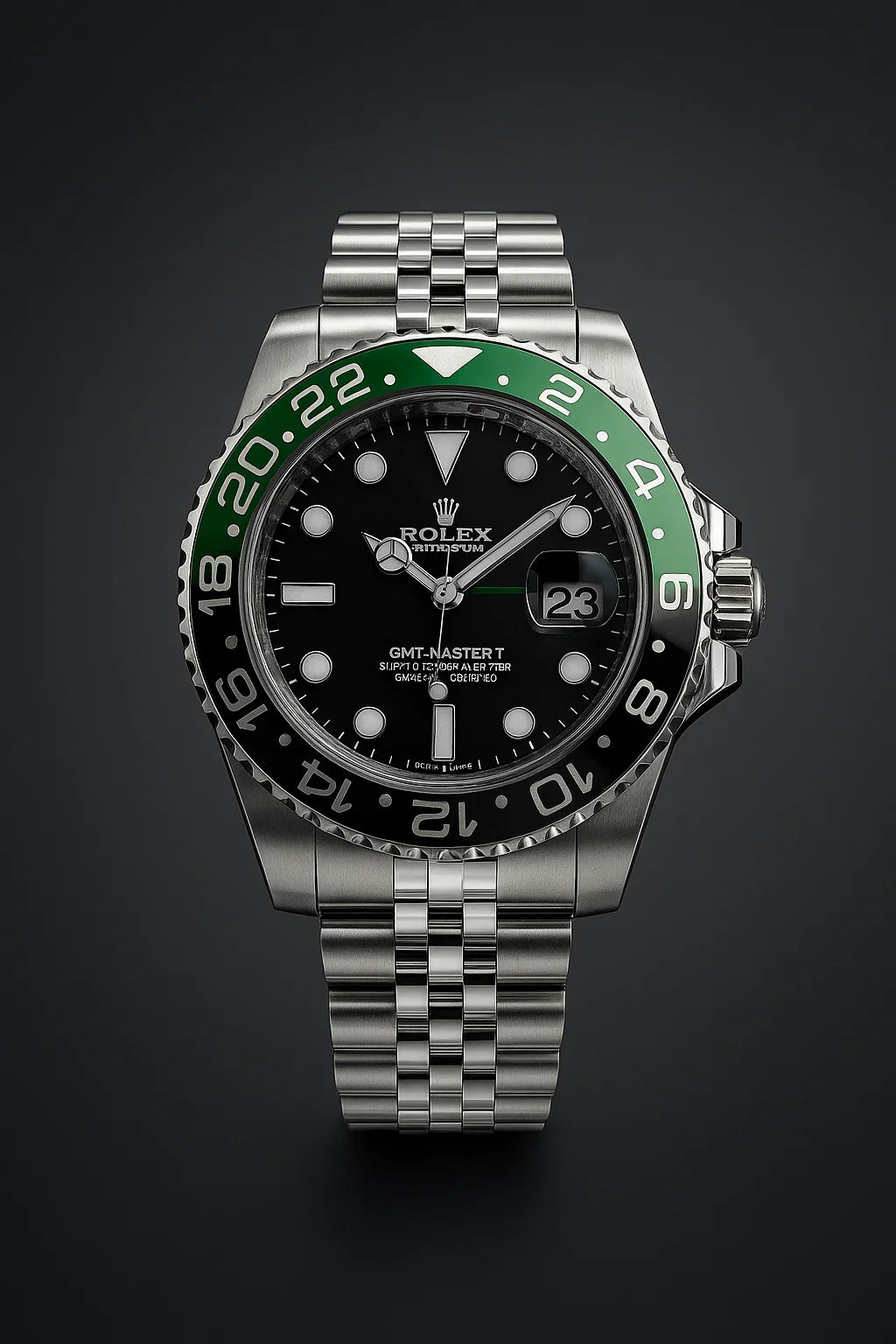 Turn heads with the RLX GMT Master Sprite Jubilee — a 40mm masterpiece featuring a bold black & green bezel and stainless steel finish. Its dual-time functionality and vibrant design make it a standout choice for travelers and trendsetters alike.