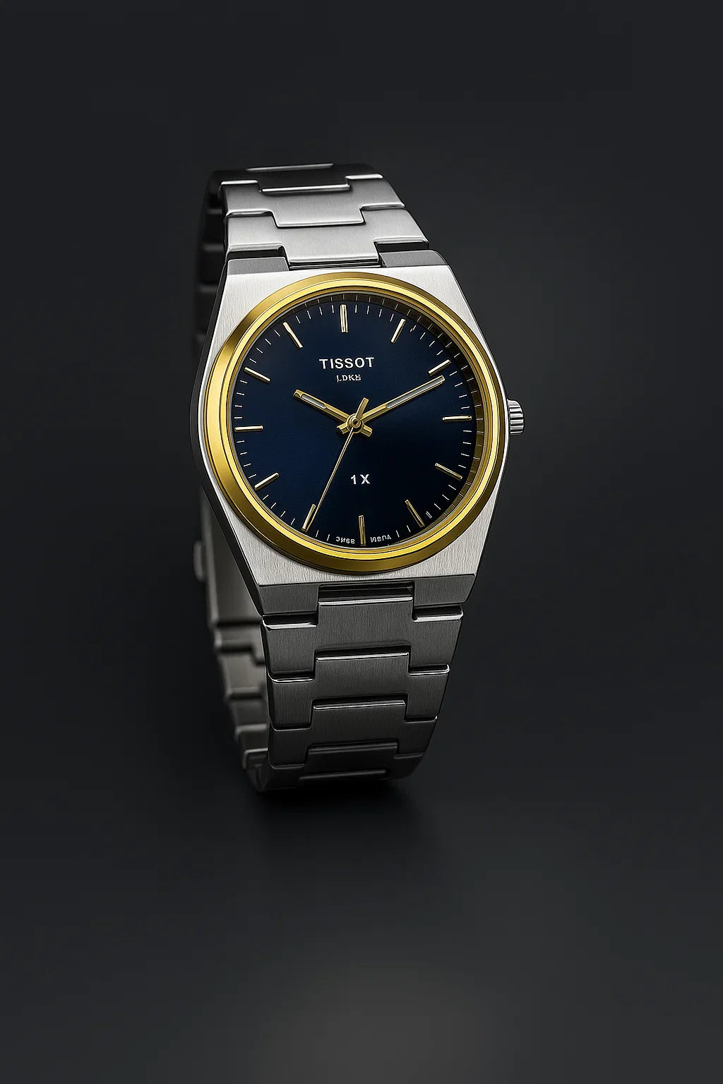 A refined fusion of vintage elegance and modern design, the Tissot PRX 35mm features a deep navy blue dial paired with a stunning golden bezel. This timepiece is perfect for those who want to stand out with sophistication and Swiss precision.